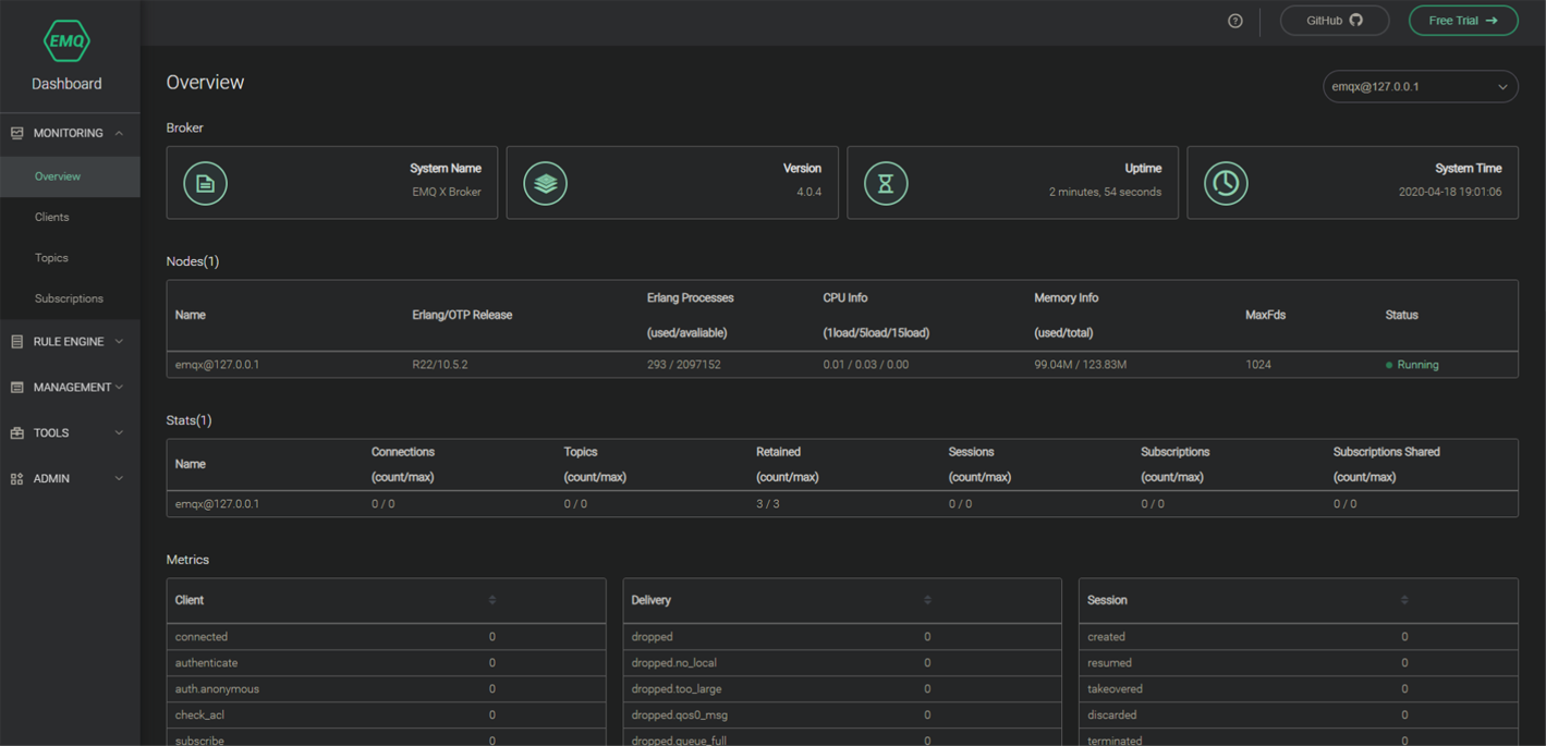 # 下载安装包 wget https://github.com/emqx/emqx/releases/download/v4.0.4/emqx-ubuntu18.04-v4.0.4.zip cd mqttd/emqx . ├── bin ├── data ├── erts-10.5.2 ├── etc ├── lib ├── log └── releases # 开启服务 ./bin/emqx start # 查看状态 ./bin/emqx_ctl status # 停止服务 ./bin/emqx stop
