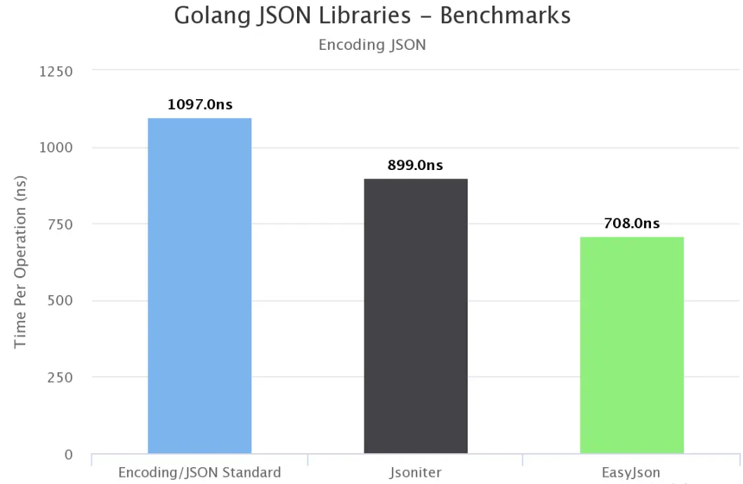 Go 有一个非常好的encoding包,它支持多种格式,比如json, XML, csv,但是快速浏览一下替代品会向你展示大量的库。我针对标准encoding/json包对 Jsoniter、EasyJson 进行了基准测试,结果如下