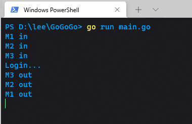 启动程序后,访问 http://localhost:8080/Login, 程序的输出如下,这和本文最上面的管道的流程图是一致的,然后访问 Register 接口, 控制台没有输出信息,当然也不会执行任何中间件。