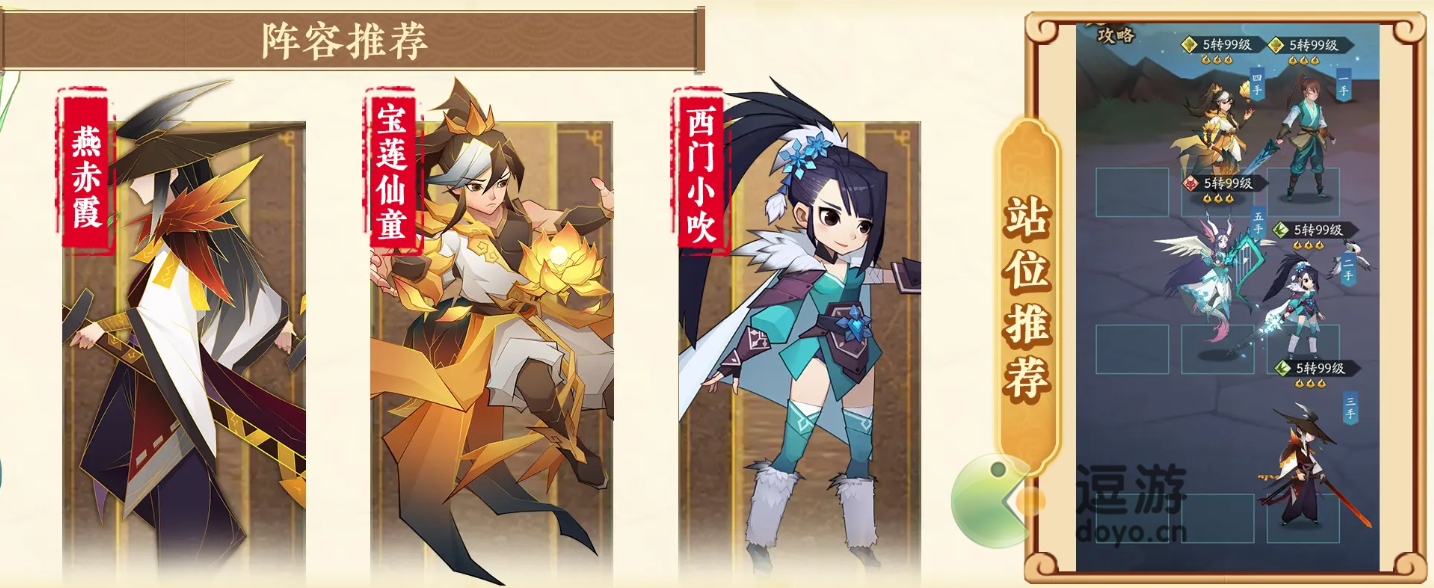 4、阵容配合:以应龙觉醒技为核心,搭配剑灵天相万剑归宗组成兼顾控制与输出的流派别。剑灵先手触发万剑天相,战法概率眩晕目标从而触发应龙普攻与剑灵飞剑。西门小吹战法嘲讽与燕赤霞满天相竖排封印均可触发应龙普攻——剑灵飞剑,宝莲仙童链接回血亦可触发全体反击和剑灵飞剑,应龙战法控制,开局降低对面气势回复。敌方受控无法释放战法就会被赋予燕赤霞符纸→三张符纸触发封印→应龙普攻→剑灵飞剑,控制与飞剑绵绵不绝。