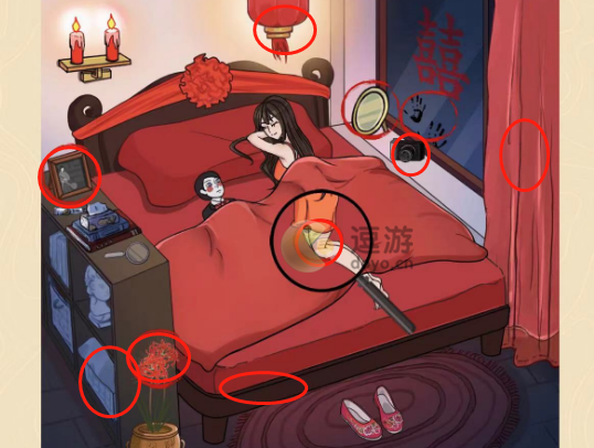 3、使用放大镜可以找到窗帘后的黑影、床下的脚、柜子里有绳索,灯笼里可以找到传呼机,新娘腿上有手印,这样就可以找齐十处细思极恐了