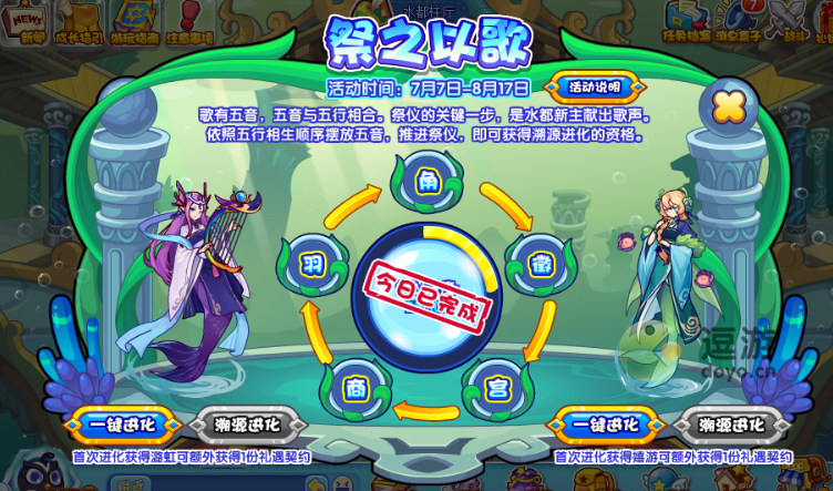 4、活动进度满一圈需要四天,可以在潞虹,嬉游任选其一进行超进化,完成其中之一活动将重置,依次反复进行下一次进化。